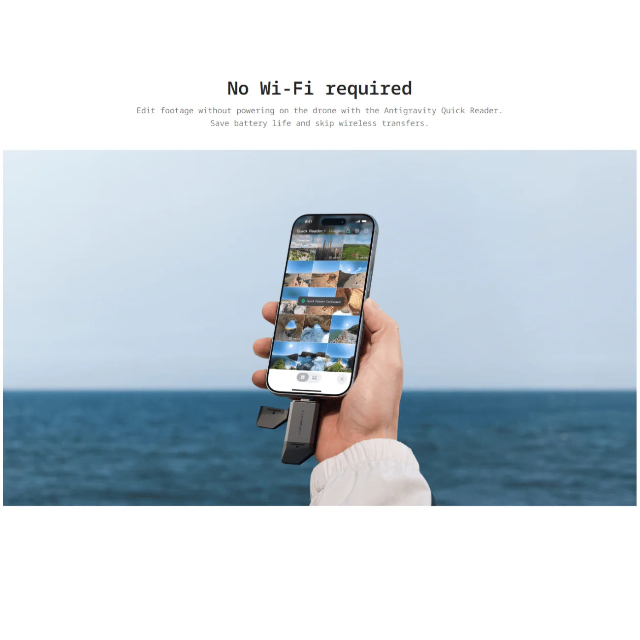Plug and play. Seamlessly connects to smartphones for instant export and editing, streamlining your workflow. Edit footage without powering on the drone. Powered by USB 3.0 for high-speed, low-latency transfers. USB-C and Lightning adapters included, and support for iOS, Android, macOS, and Windows.