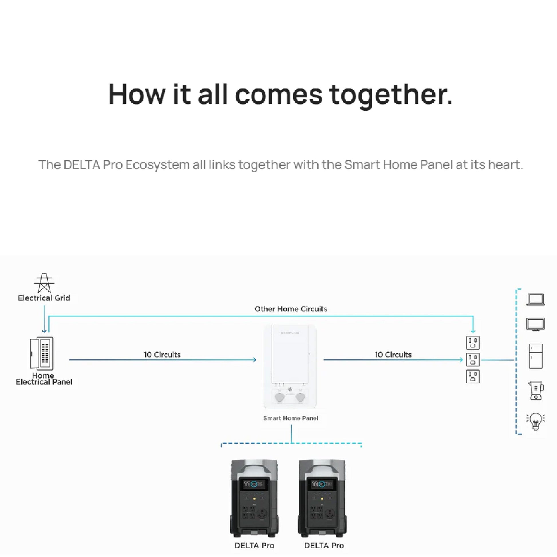 The Ecoflow Smart Home panel has been specially developed by Ecoflow for the DELTA Pro Ecosystem and connects the DELTA Pro Power Station(s) and extra batteries directly to your main electrical panel*. This allows you to create a home system with maximum output power of 3600W with 21.6 kWh capacity when combined with DELTA Pro and 2 Extra Batteries, the maximum output power is 3600W and the capacity depends on whether the Delta Pro is combined with an extra battery and/or a Smart Generator. Link up to 10 of your Smart Home Panel home circuits for uninterrupted power during power outages and smart energy management. The maximum current for channels 1-4 is 30A. The rest have a maximum current of 20A.