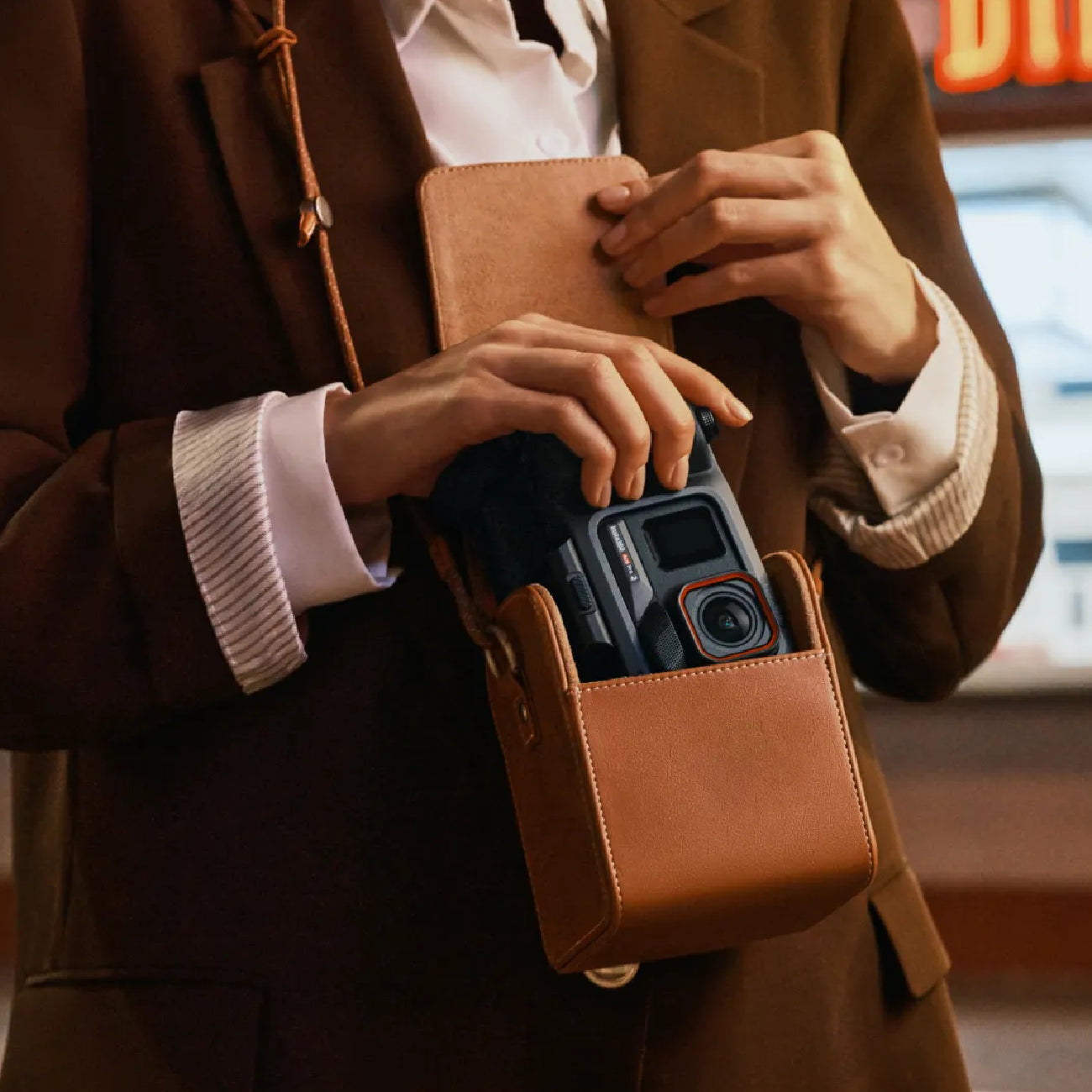 A classic leather case with a modern edge. Adjustable shoulder strap for comfort and flexibility. Store Insta360 Ace Pro 2 with the Xplorer Grip Pro Kit, Pocket Printer, and 10× Photo Papers Cartridges, or your everyday essentials.