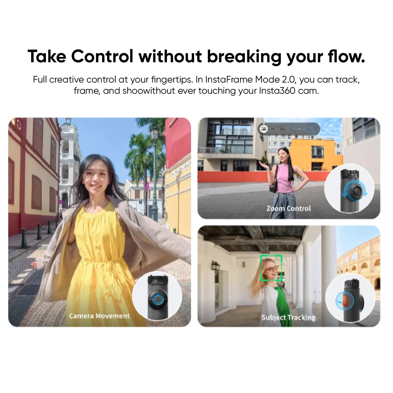 - In InstaFrame Mode 2.0, you can track, frame, and shoot without ever touching your Insta360 cam