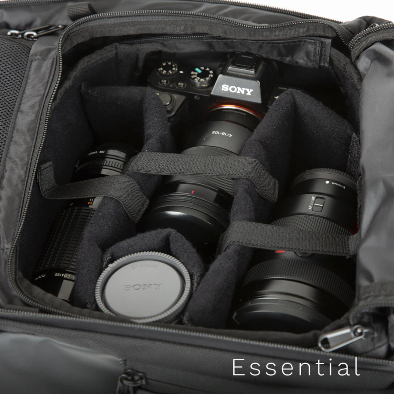 The Essential Plus Camera Cube includes 2 long dividers, 3 short dividers, and 3 elastic straps.